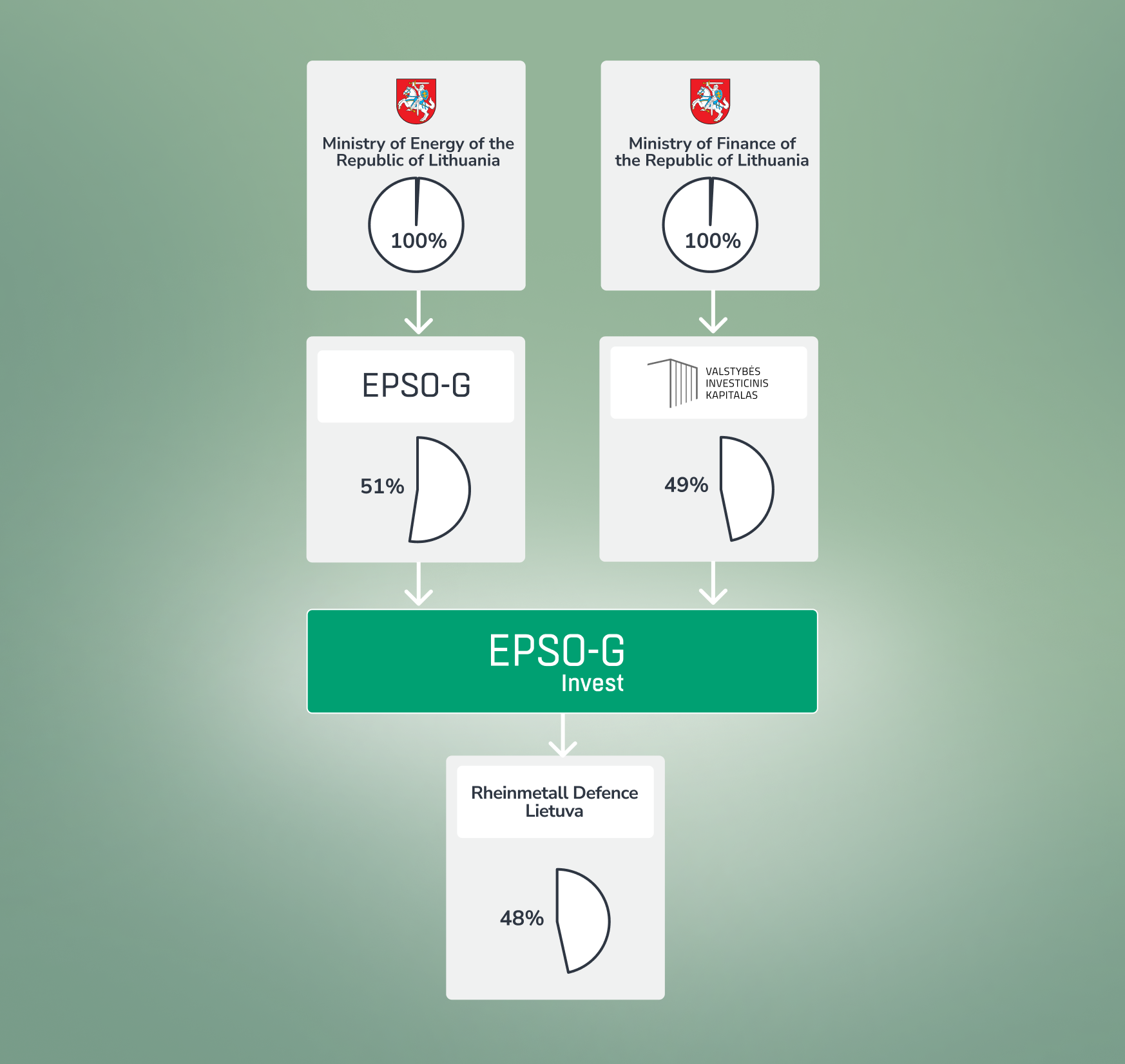 EPSO-G Invest owns 48% of the shares in Rheinmetall Defence Lietuva, which is developing a 155 mm artillery ammunition factory in Baisogala, Lithuania. Rheinmetall Waffe Munition holds 51% of the shares, while Giraitės Ginkluotės Gamykla owns the remaining 1%.